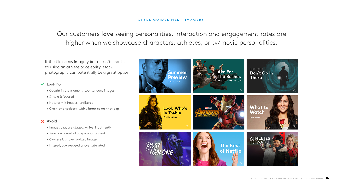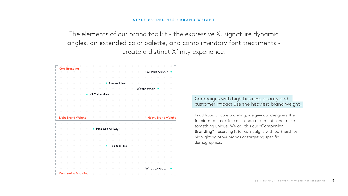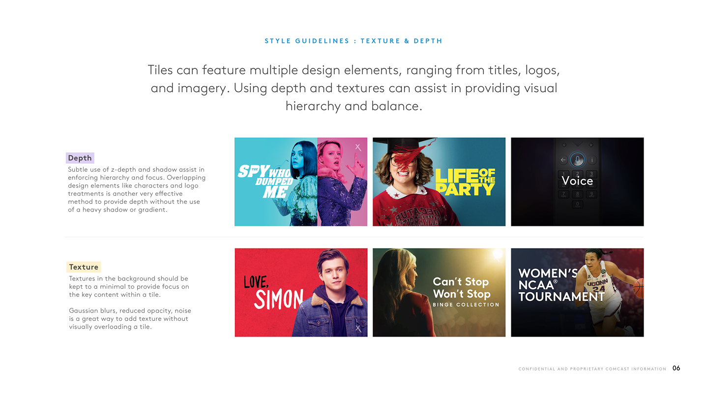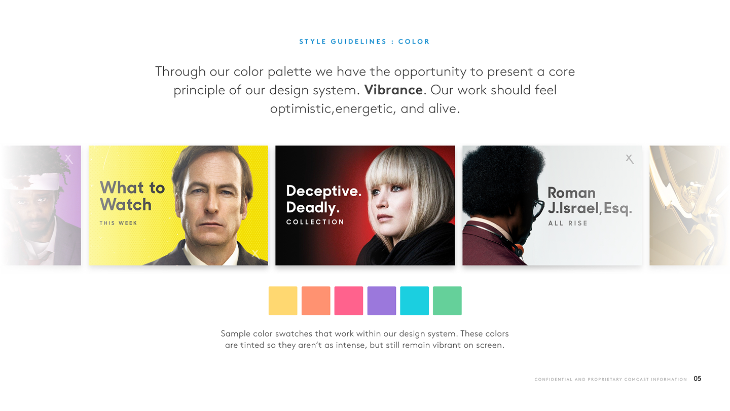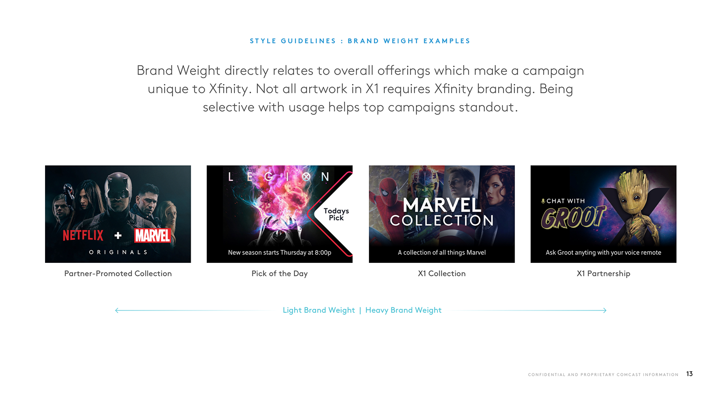 The Xfinity Visual Style Guide established a "brand weight" system that transformed how promotional content was designed for the video platforms. This framework provided clear standards for when to deploy Xfinity's signature elements like the expressive X, dynamic angles, and extended color palette versus when to let partner content take center stage. By codifying everything from pixel specifications to high-level art direction, the guide drove customer engagement through structure, consistency, and strategic visual hierarchy which helped in creating a sustainable system where both Xfinity's brand and its content partners could thrive.